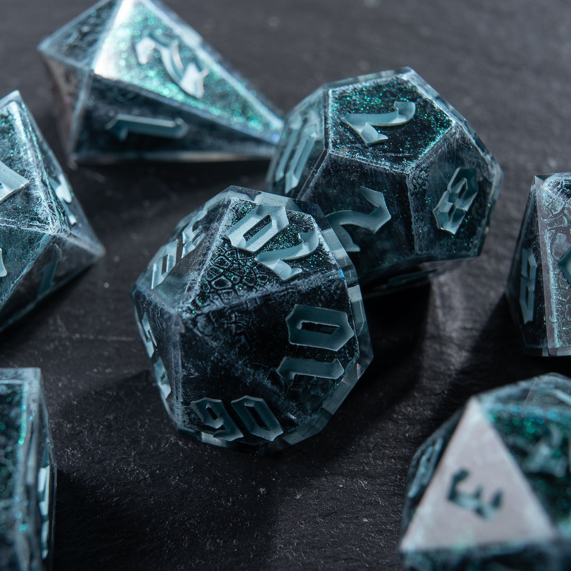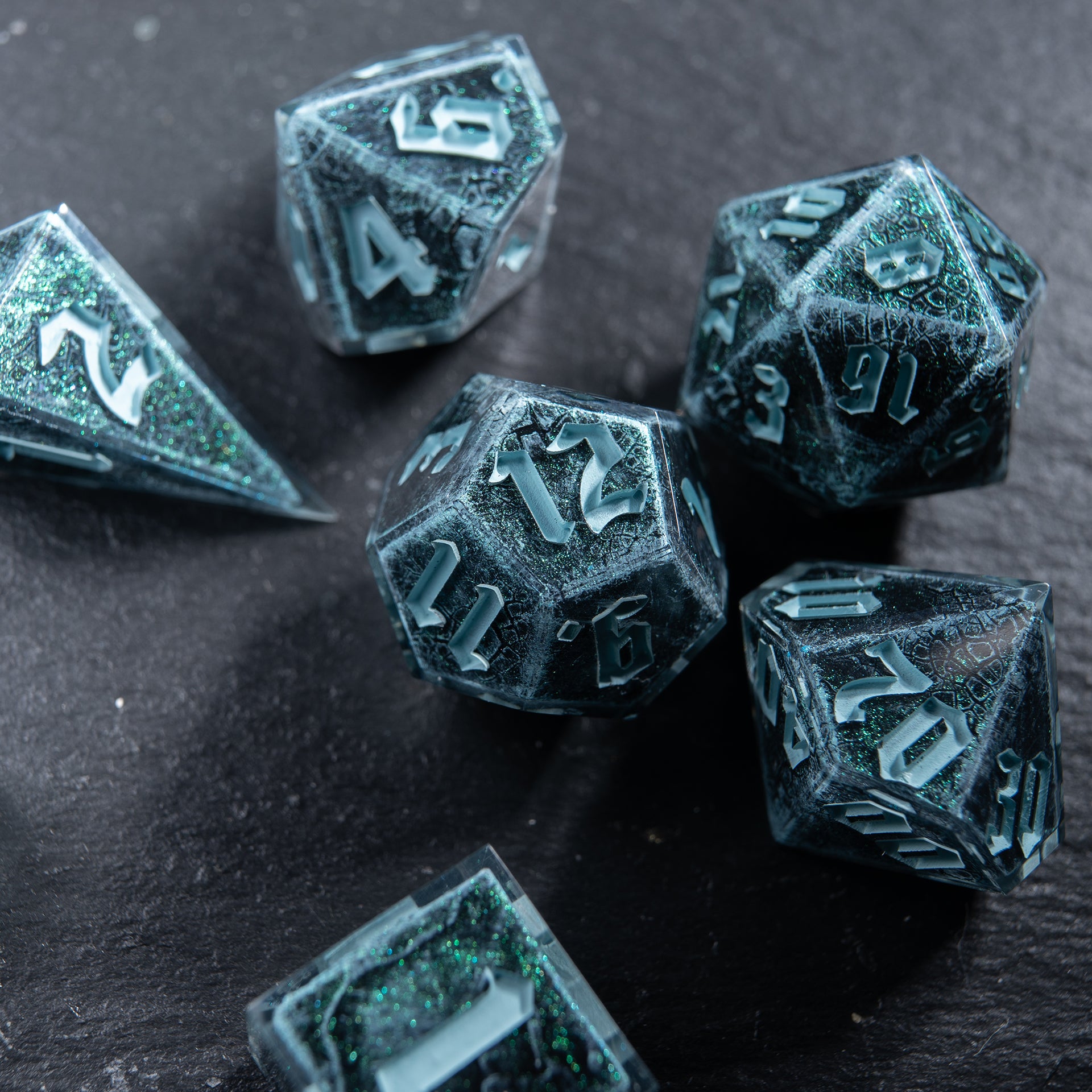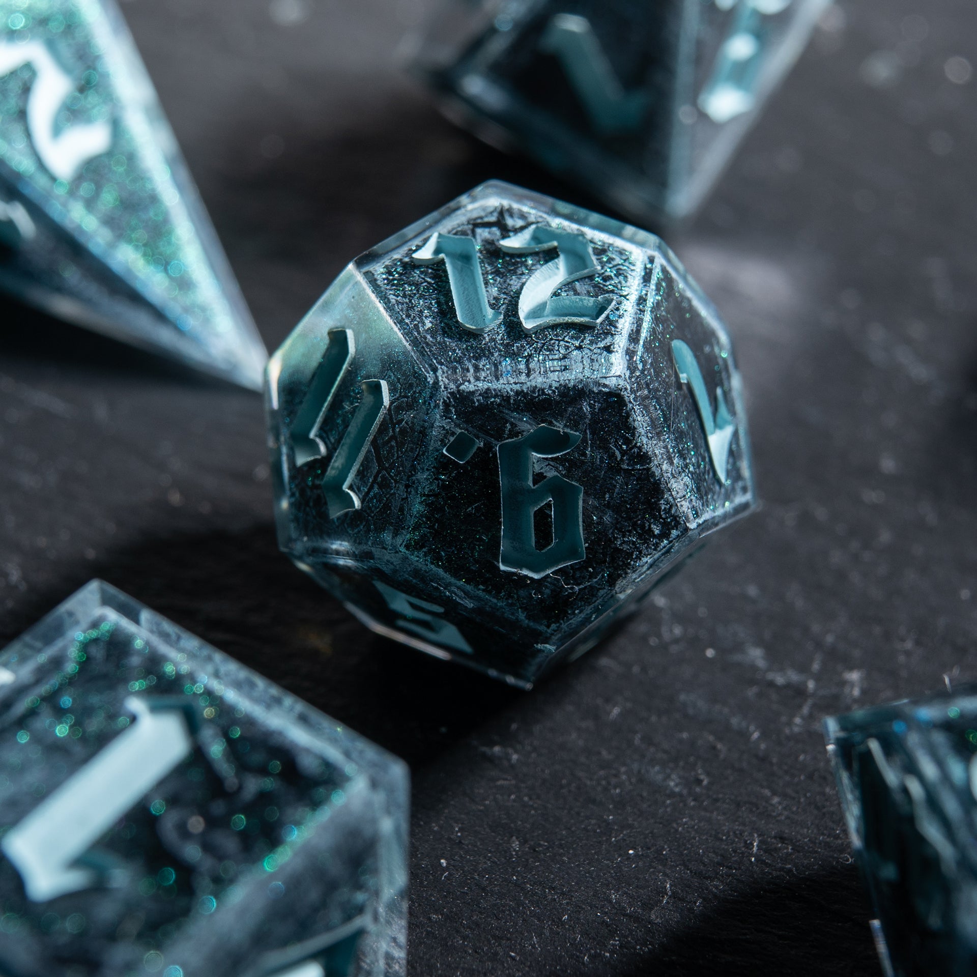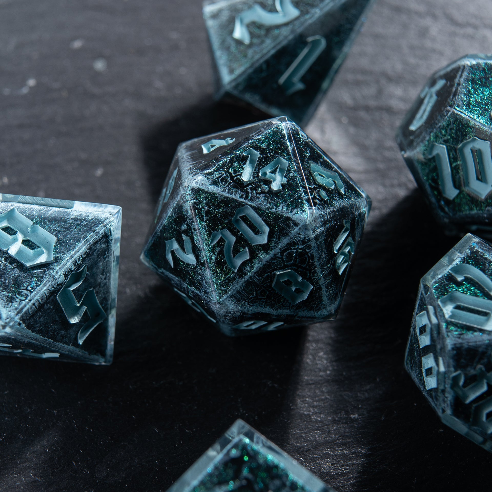 These dice have been cast in an pressurised pot to ensure they are balanced and bubble free. They are handmade from start to finish - casting, sanding, polishing and painting. Each set of dice turns out unique and has its own special character.