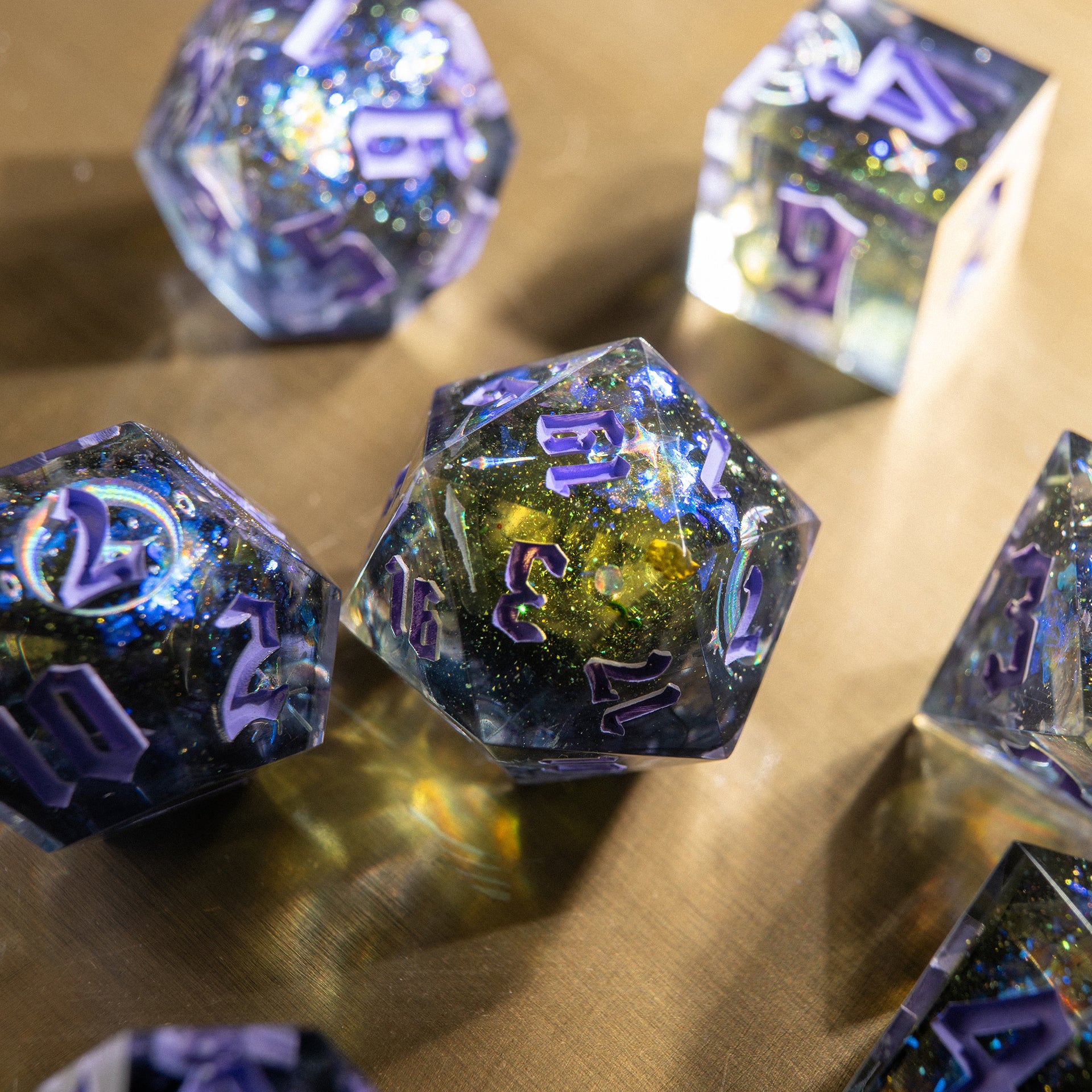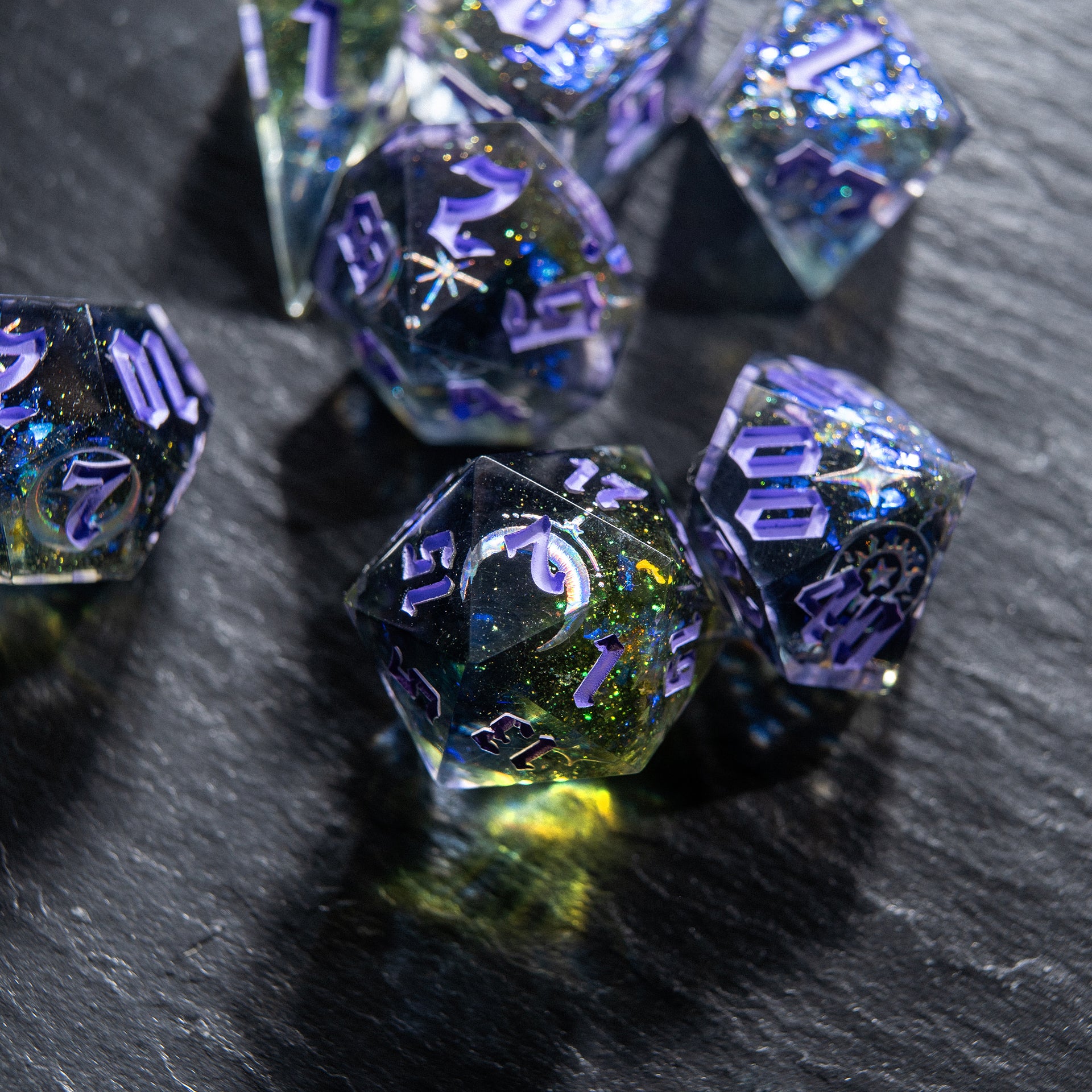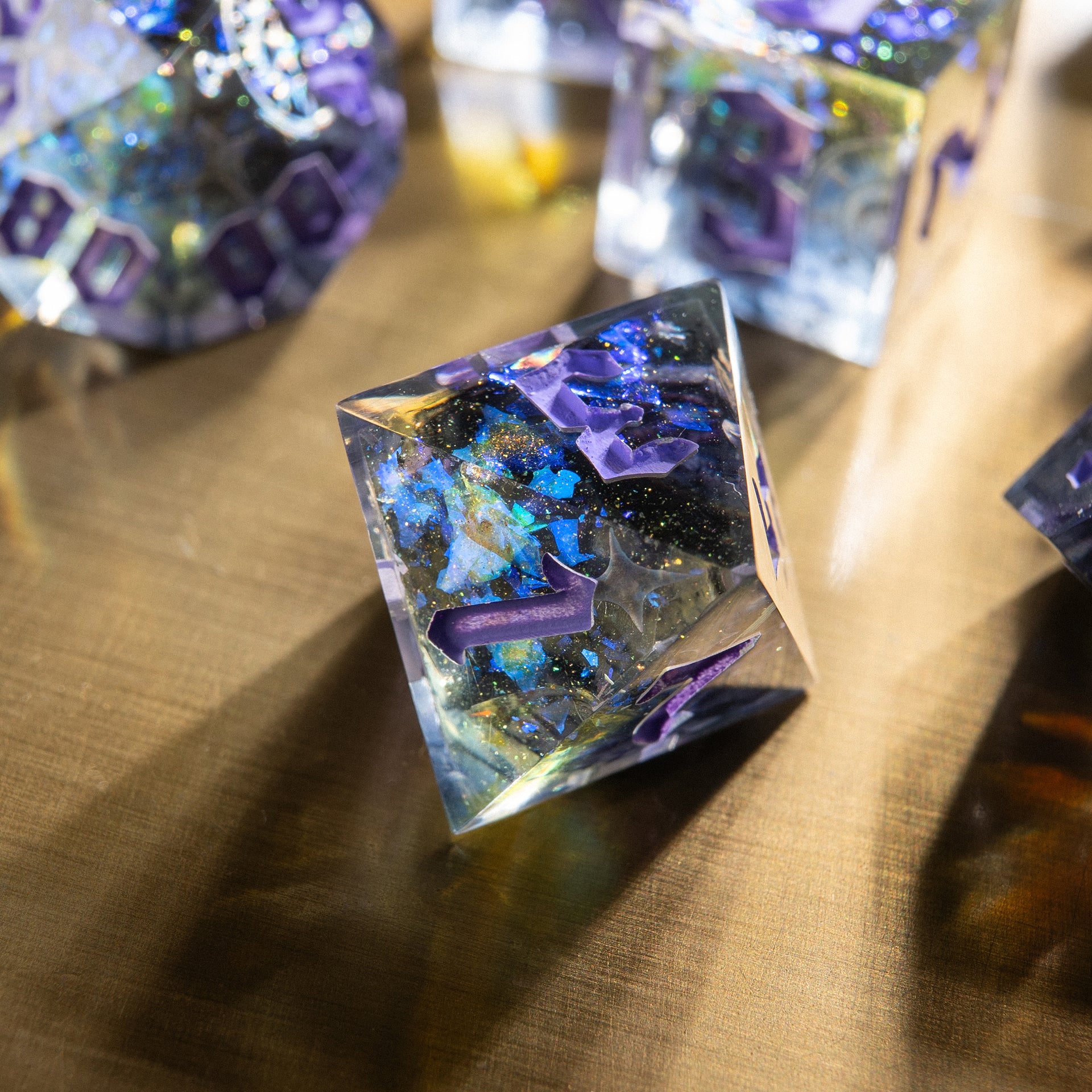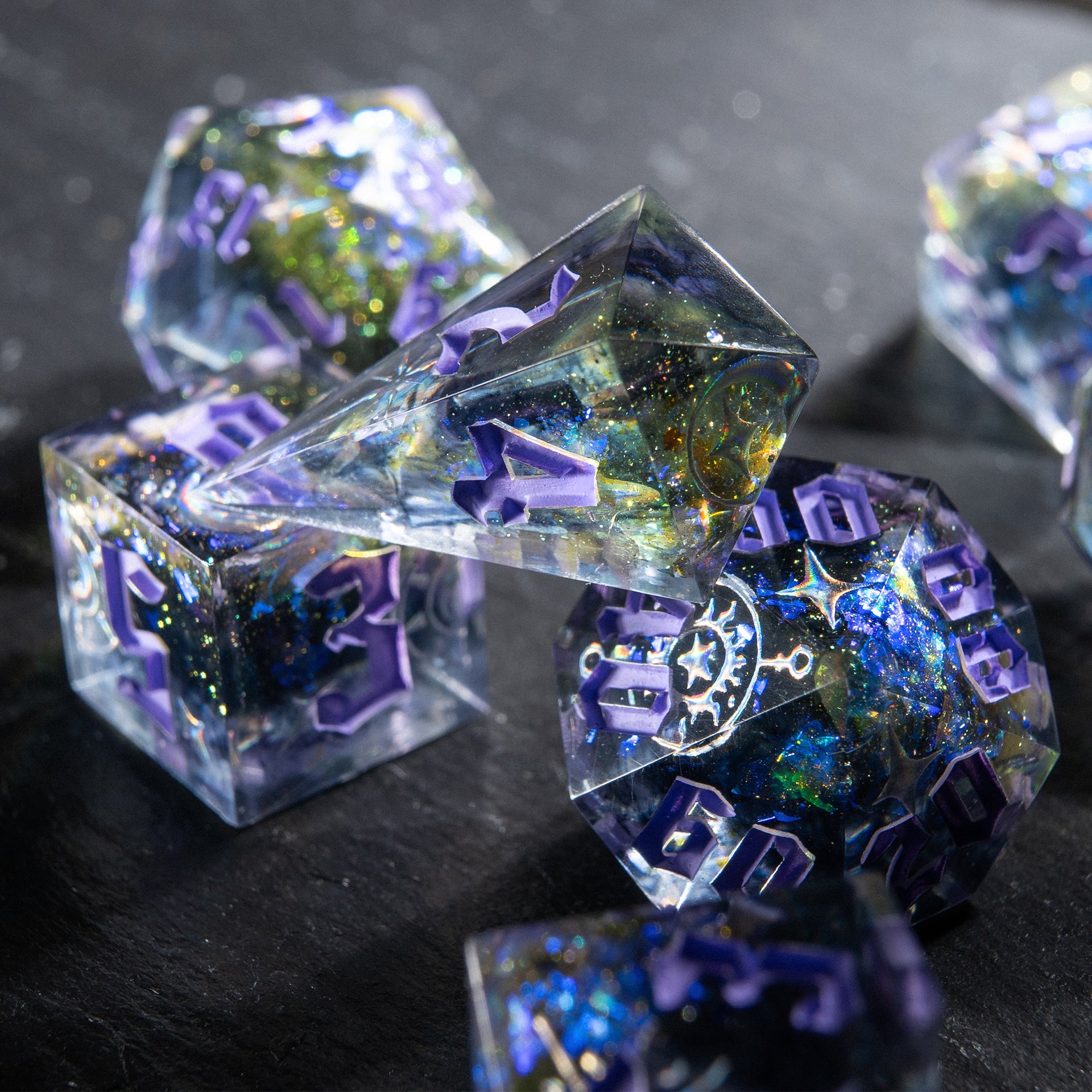 When the last star of the ancient Empire vanished, it left behind only emptiness — shimmering, deep, whispering in tongues no one remembers. These dice seem carved from the remnants and filled with the ghostly light of fallen constellations.