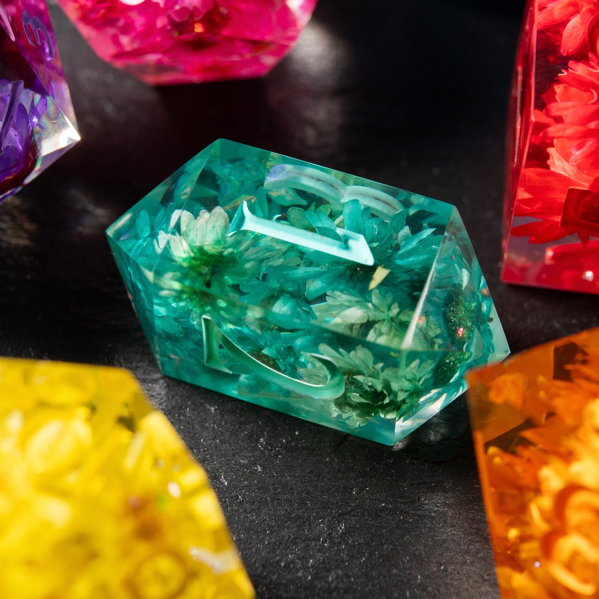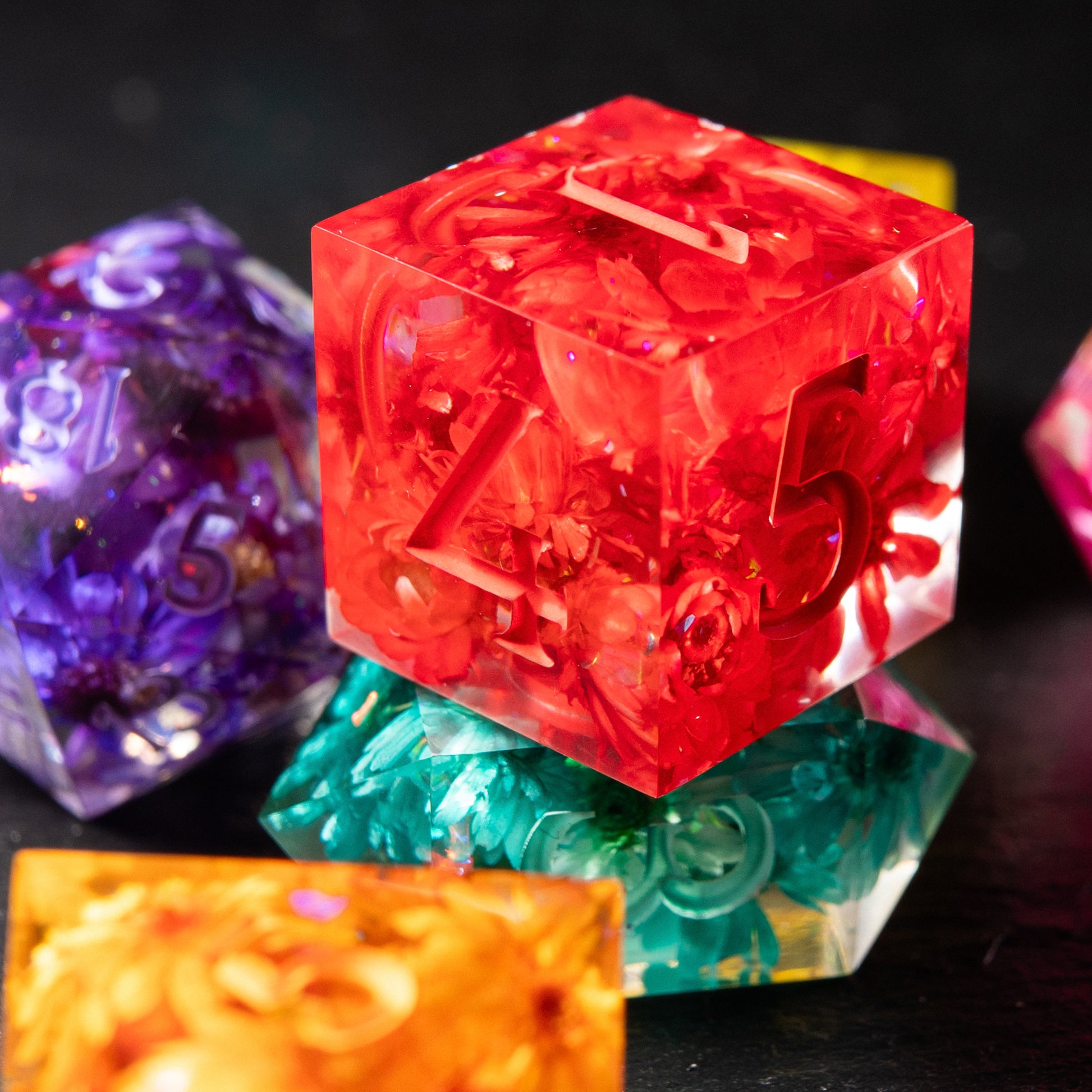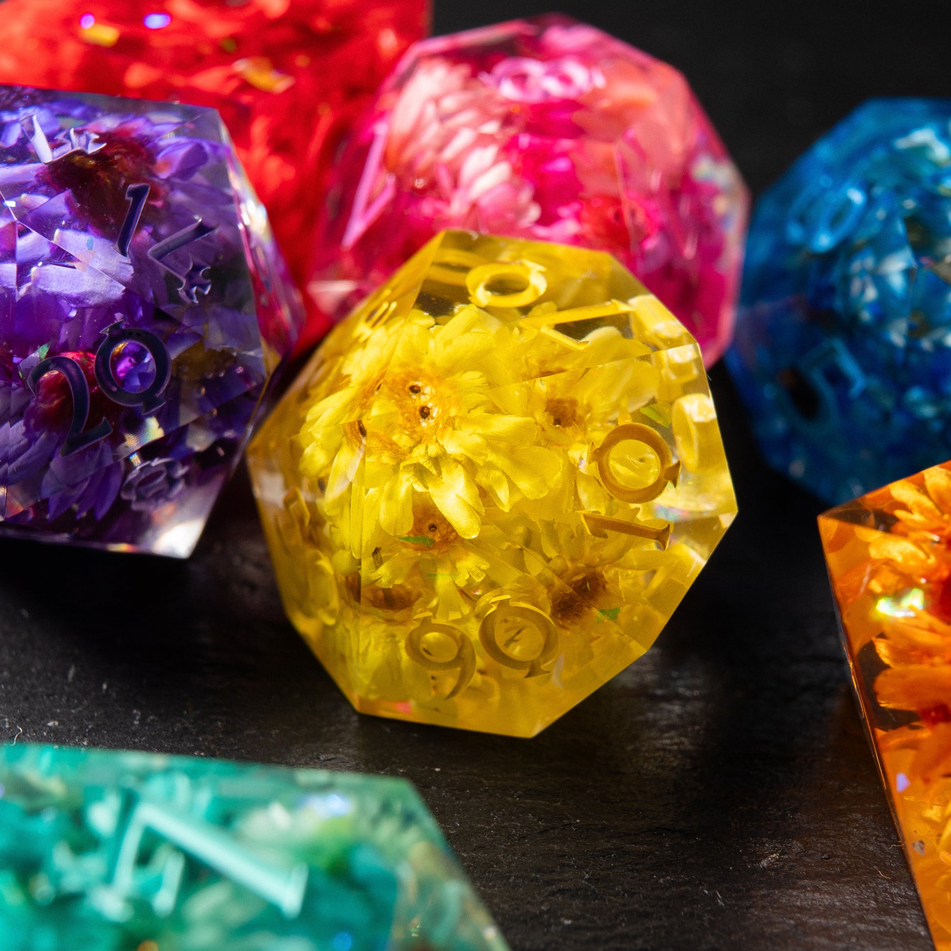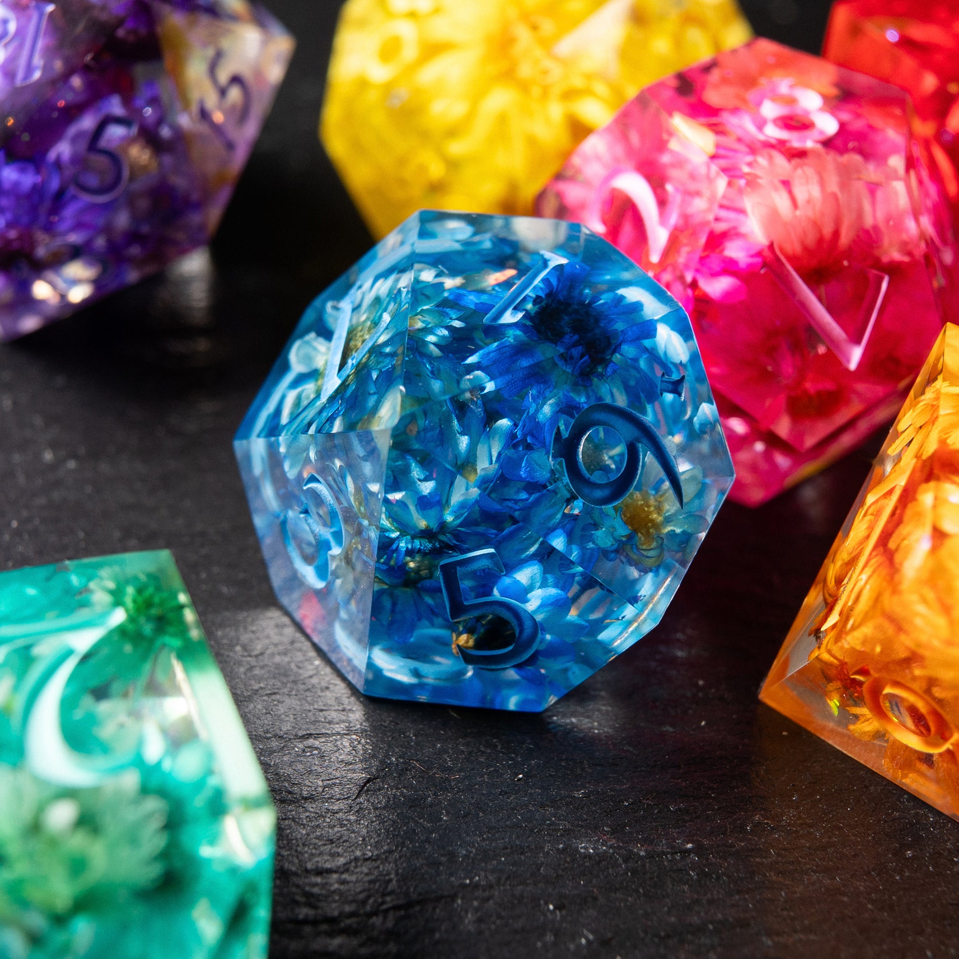 In hidden groves where druids weave their spells, flowers bloom only once before fading into myth. The Eternal Blossoms dice are said to preserve those sacred petals, captured at the height of their beauty and sealed in crystal resin.