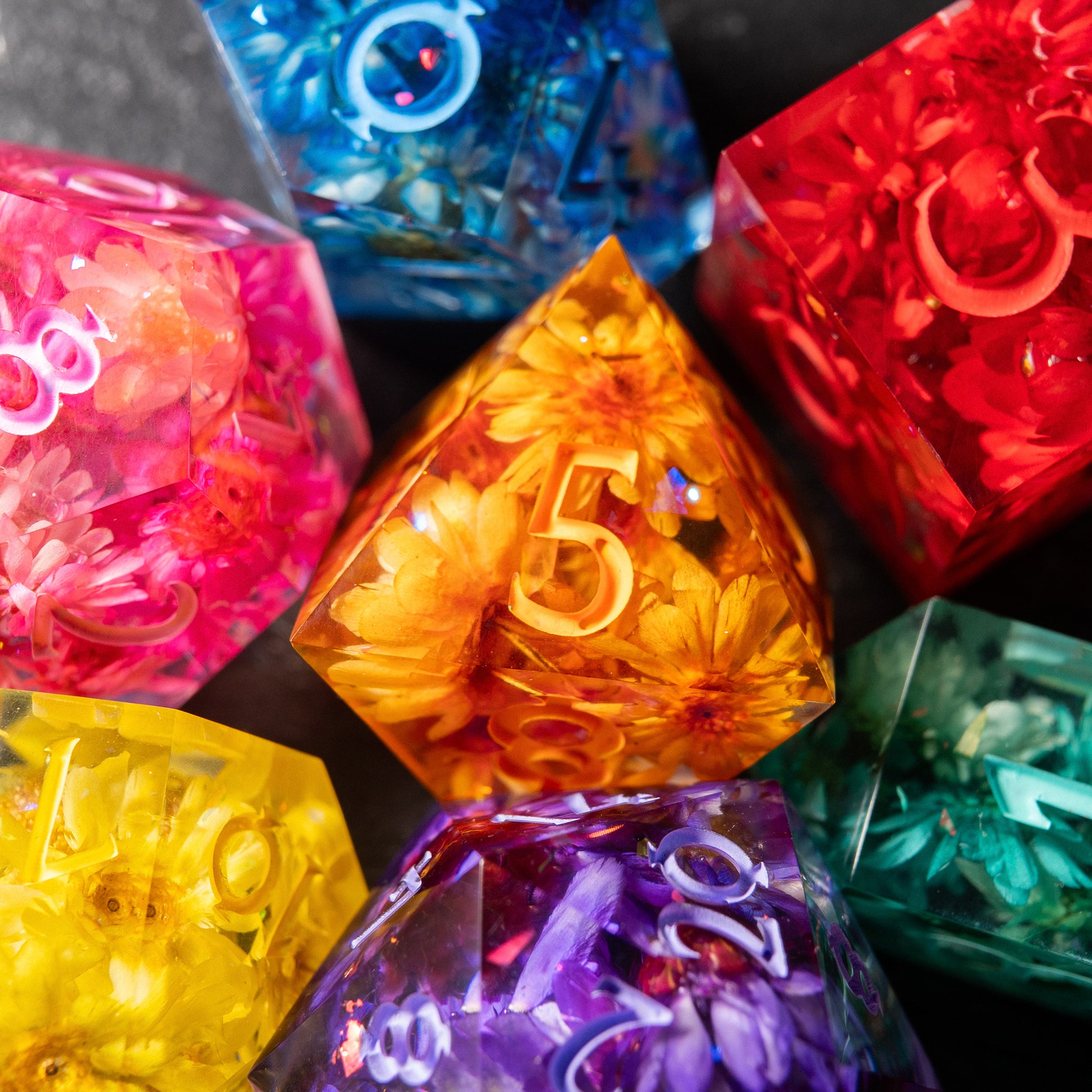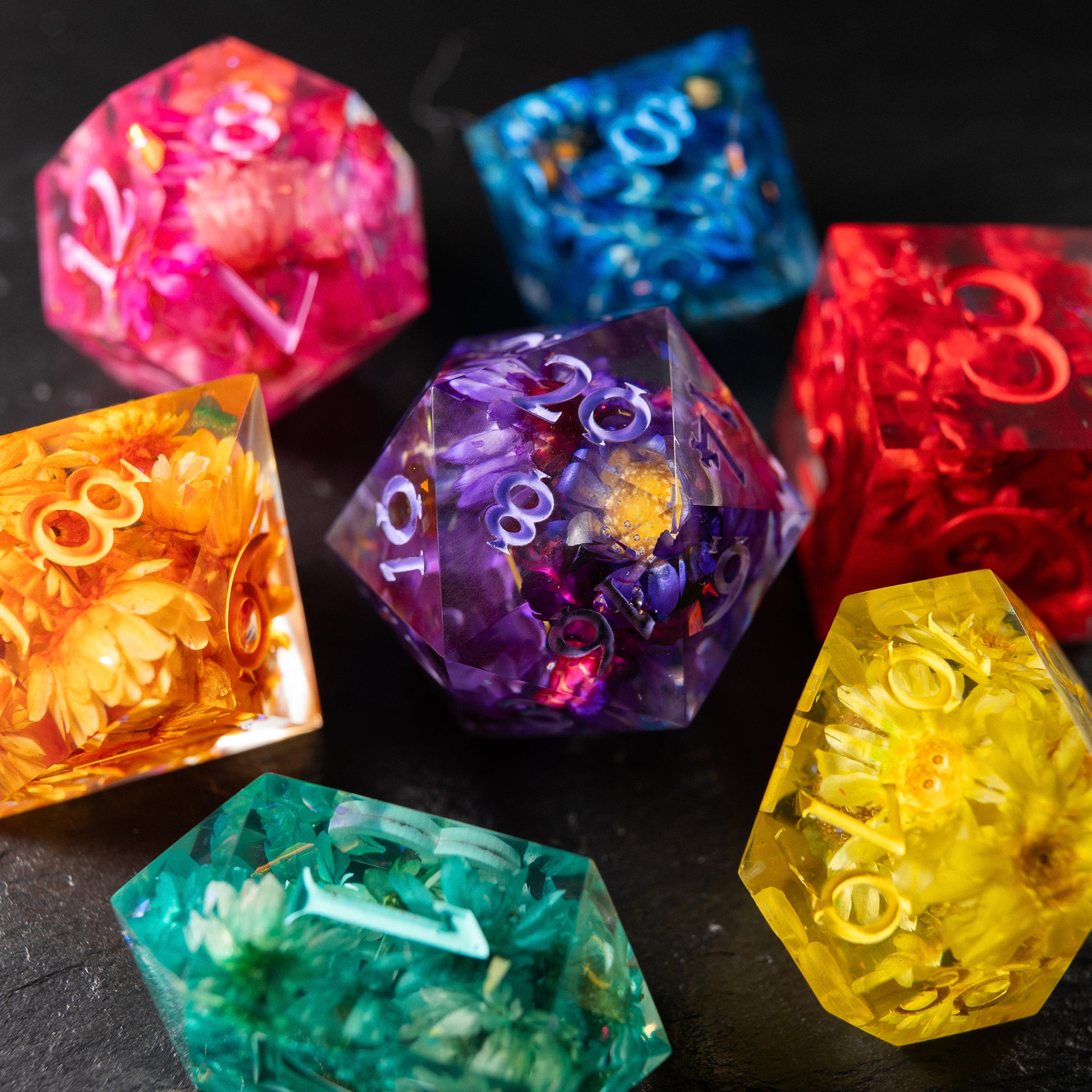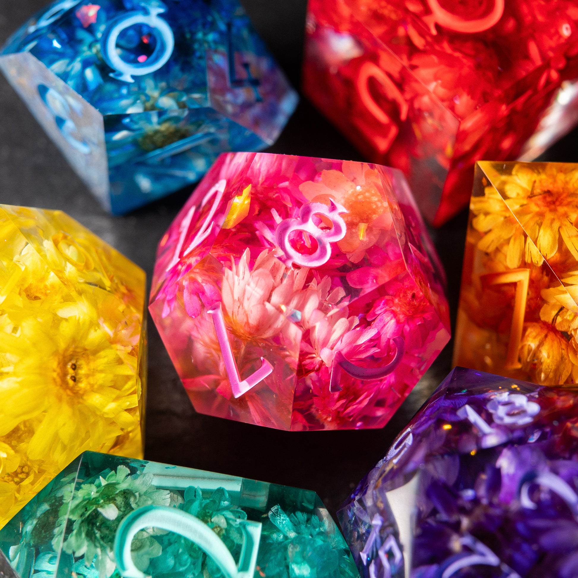 Handmade resin dice set “Eternal Blossoms” – artisan polyhedral dice with real flowers inside for Dungeons & Dragons and tabletop RPGs.