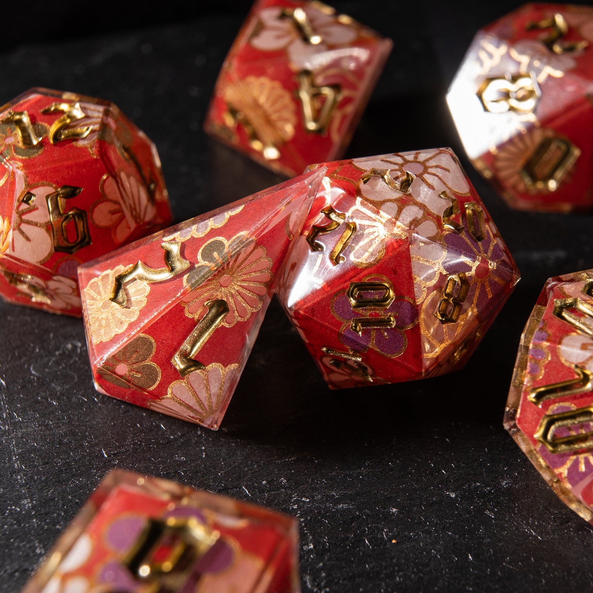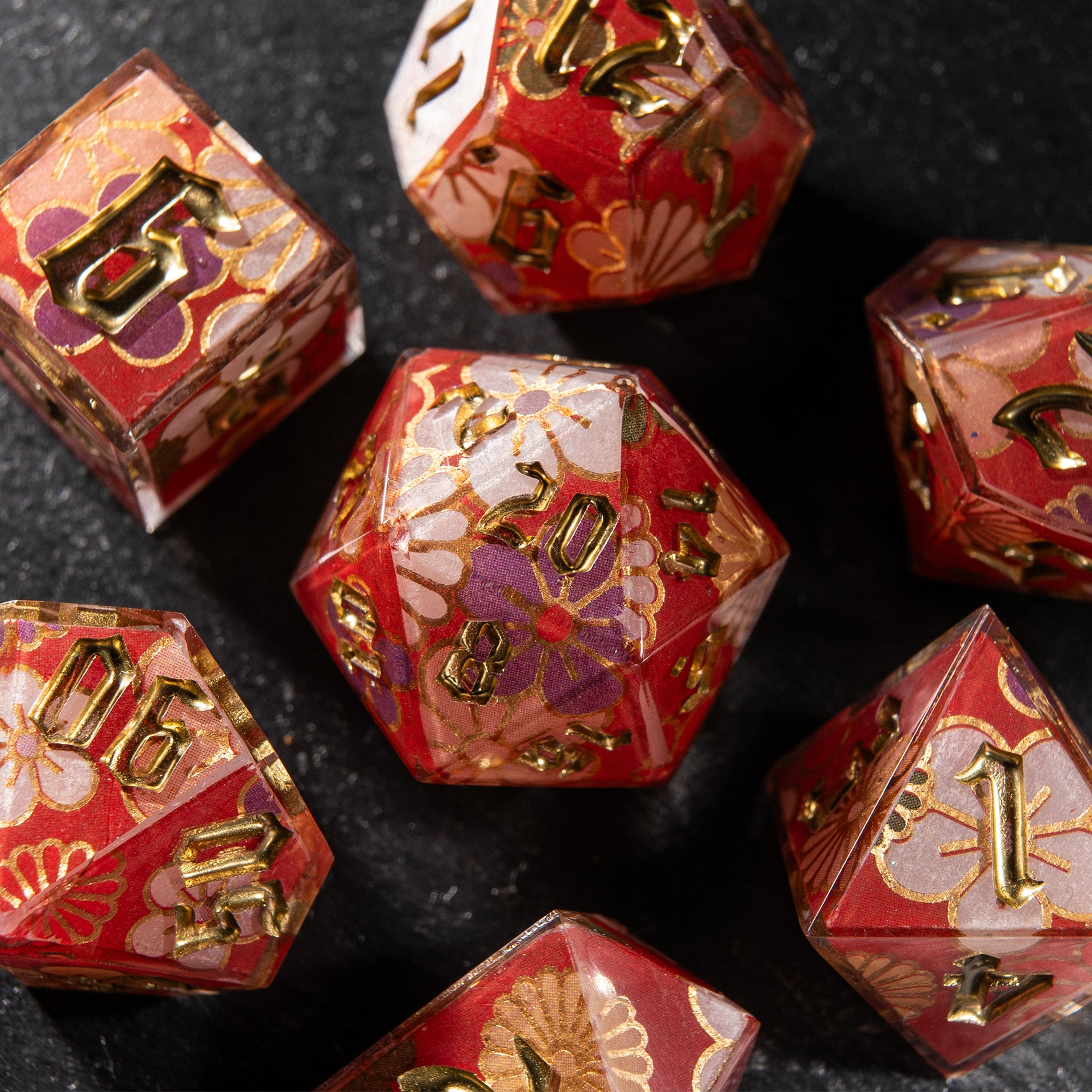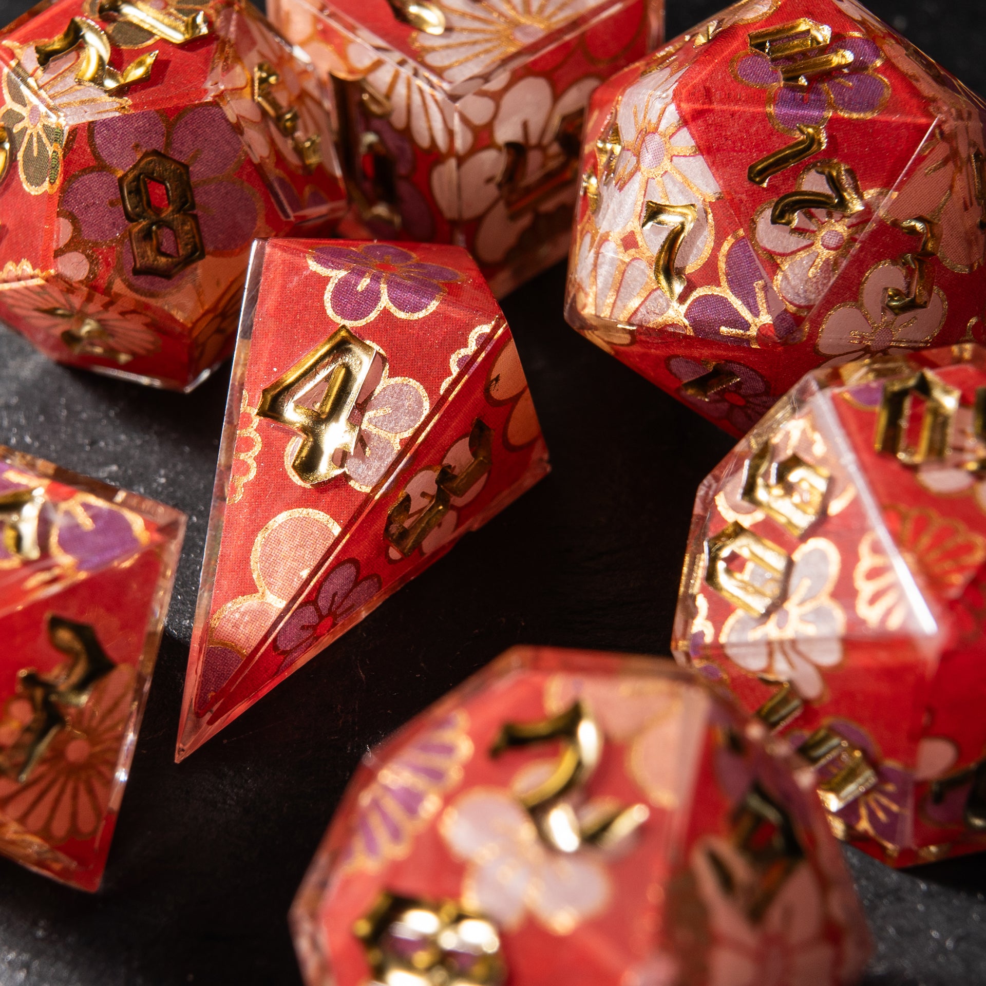 Floral patterns, golden accents, and a translucent shimmer — these dice feel as if they were woven from festive kimono fabric. They carry the gentle breath of spring, tea ceremonies on a veranda, and the rustle of silk in a quiet temple.