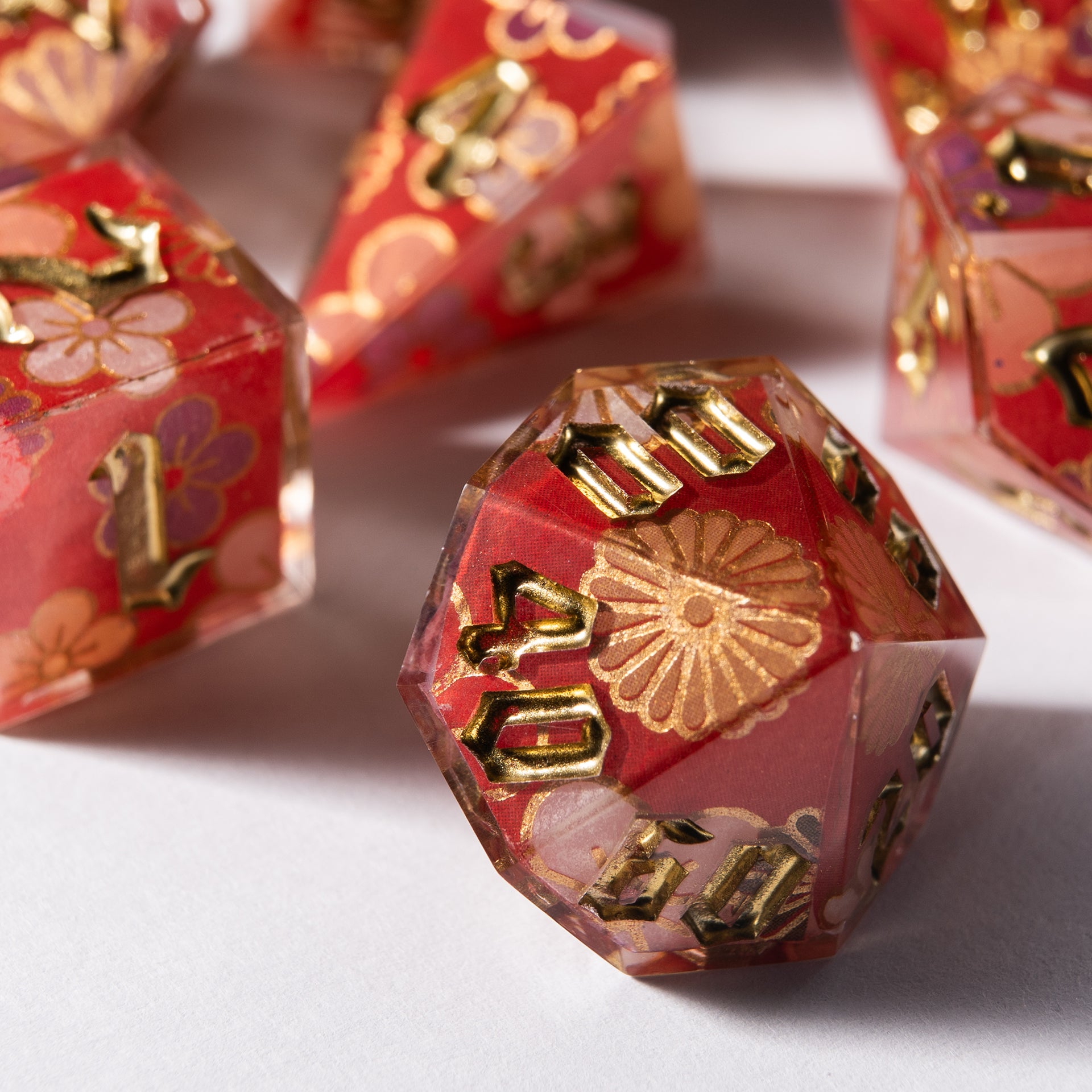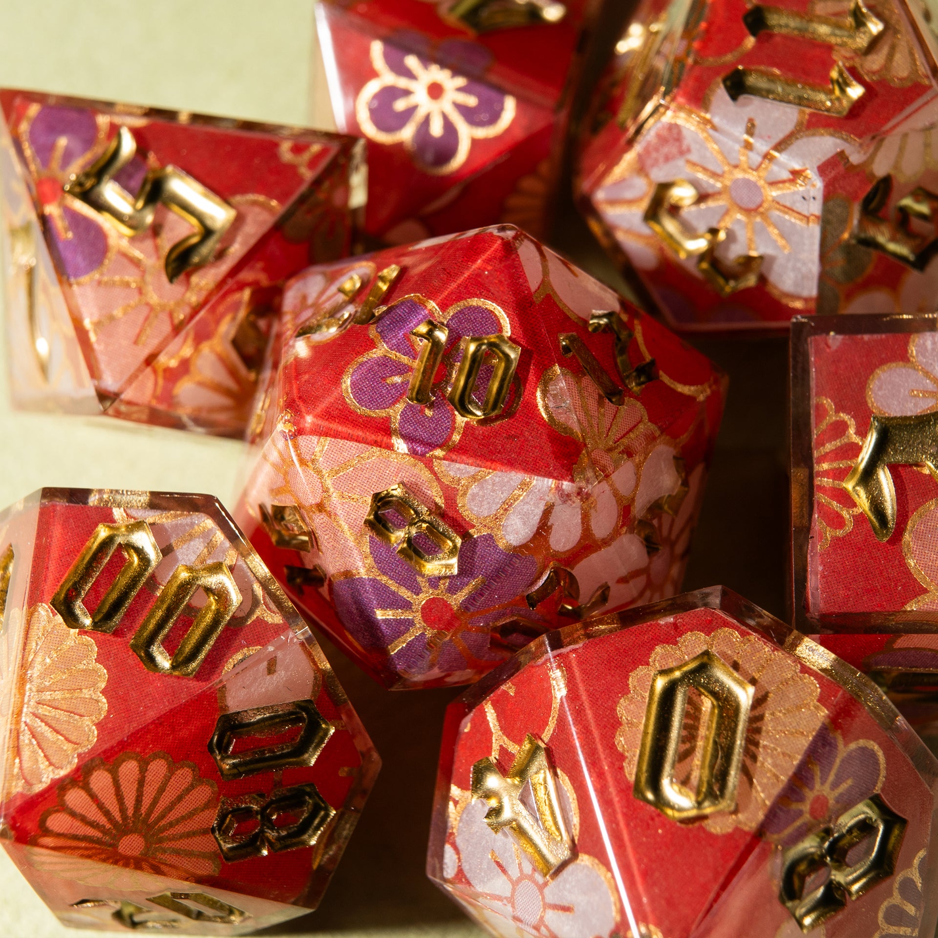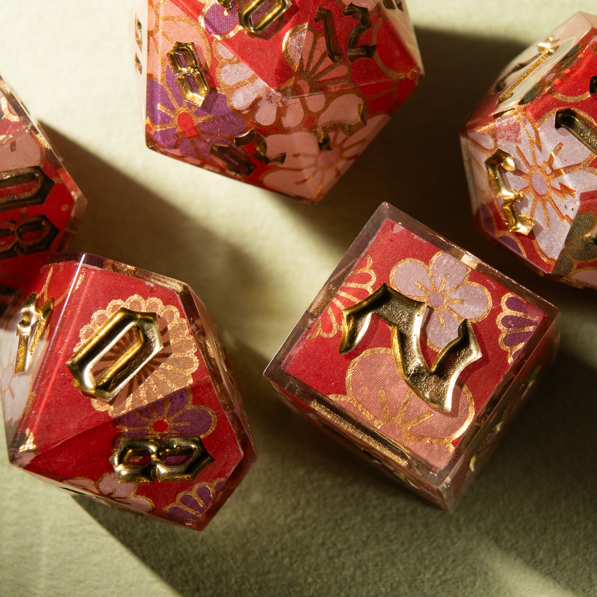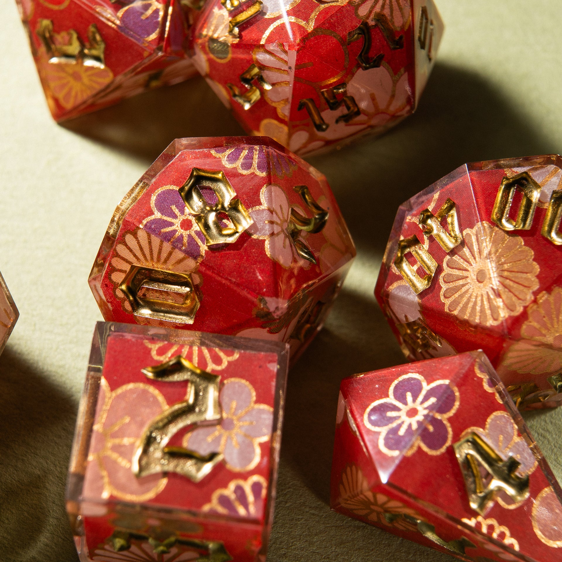 Floral patterns, golden accents, and a translucent shimmer — these dice feel as if they were woven from festive kimono fabric. They carry the gentle breath of spring, tea ceremonies on a veranda, and the rustle of silk in a quiet temple.