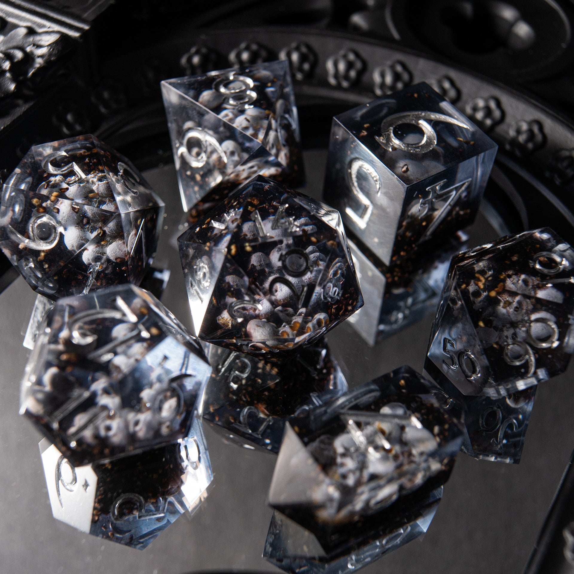 These dice have been cast in an pressurised pot to ensure they are balanced and bubble free. They are handmade from start to finish - casting, sanding, polishing and painting. Each set of dice turns out unique and has its own special character.